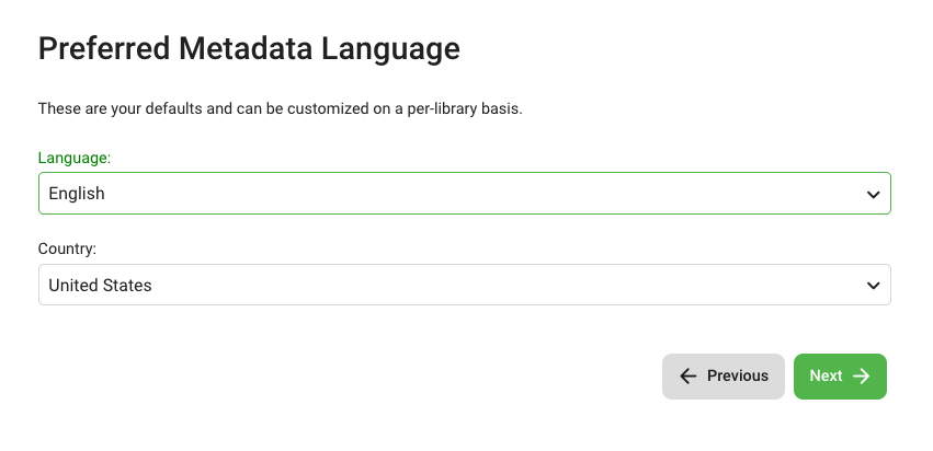 7. Select your Preferred Metadata Language and Country (English and United States are recommended) and click Next.
