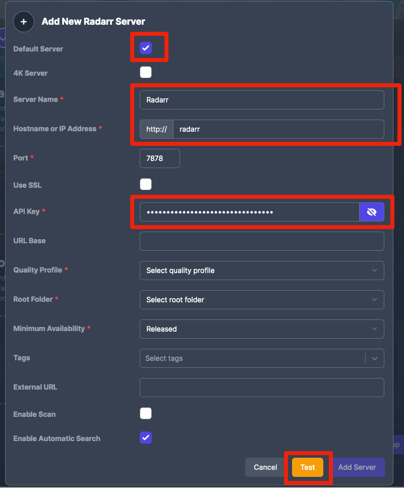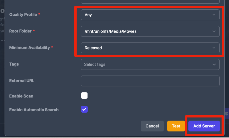 - Select a Quality, Root Folder, and Minimum Availability, then click "Add Server". This will return you to the screen from the previous step. Click "Add Sonarr Server"
