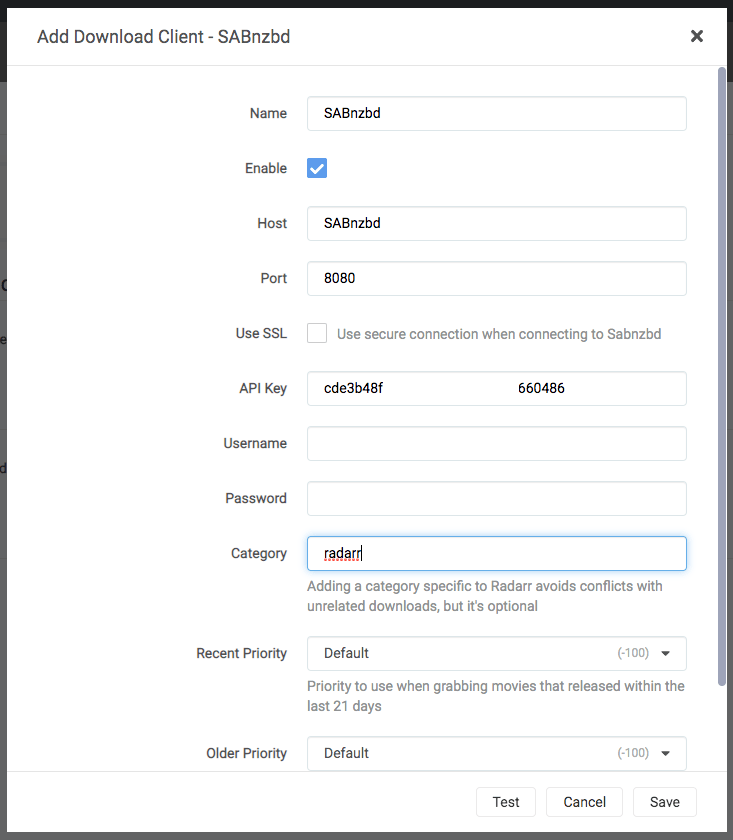Note that the category matches between Radarr and SABnzbd. The specific category doesn't matter; just that they match.