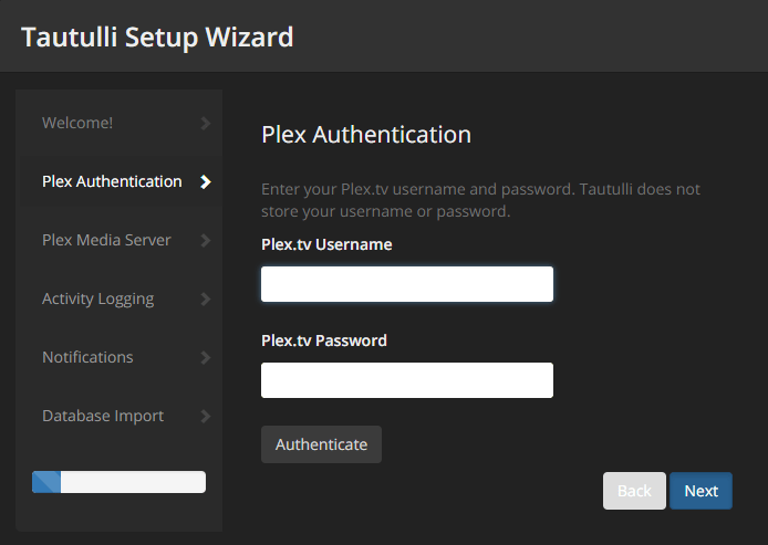 2. On the "Plex Authentication" page, sign in with your Plex username and password, and click Authenticate. When you see the "Authentication successful." message, click Next.